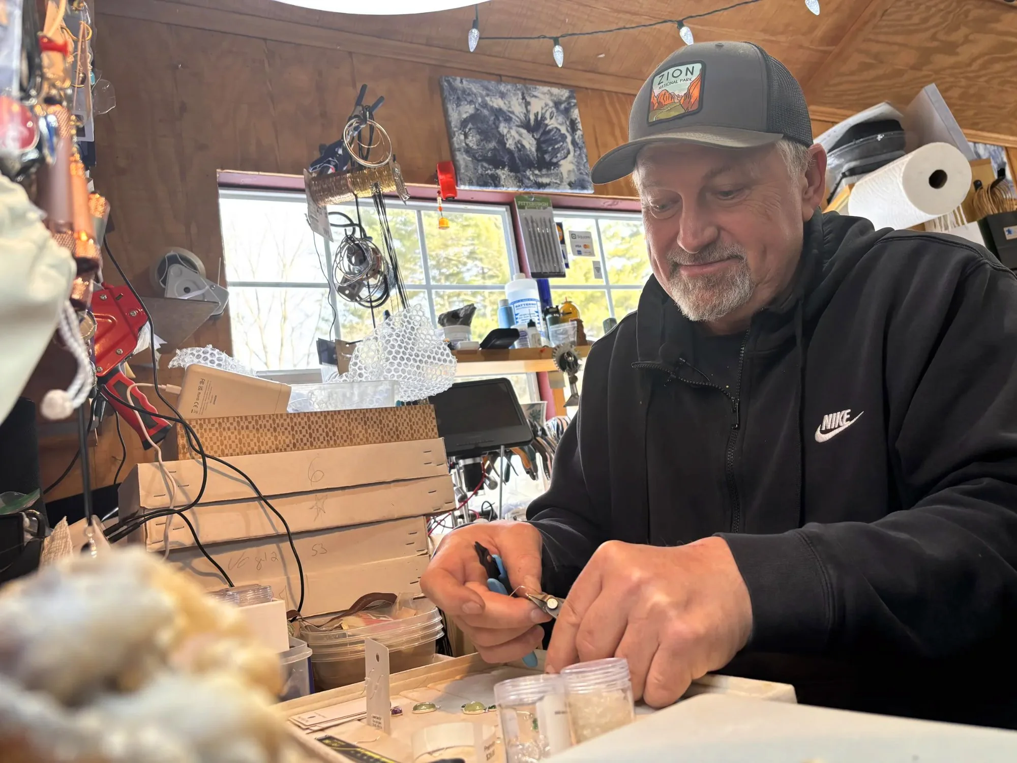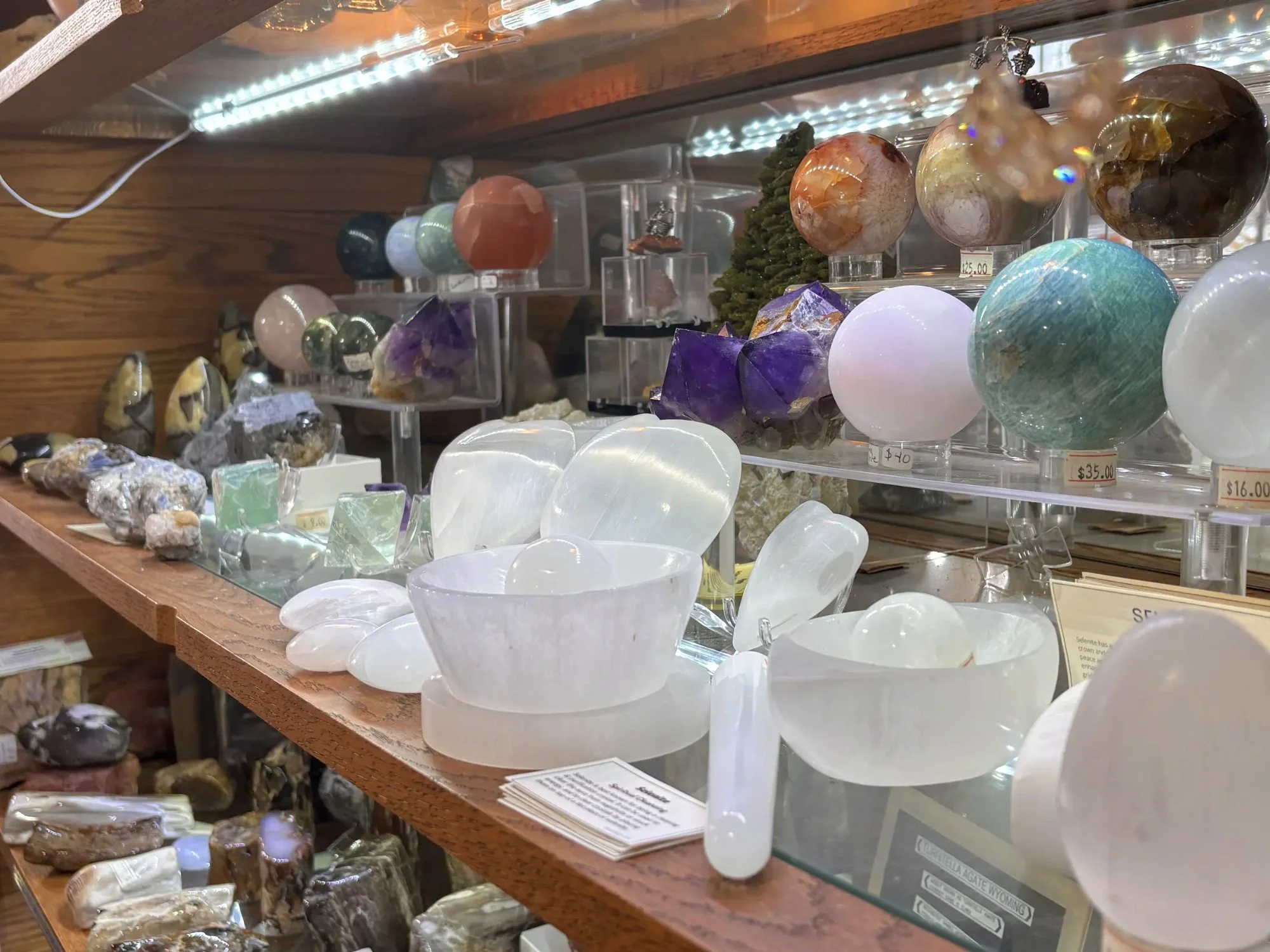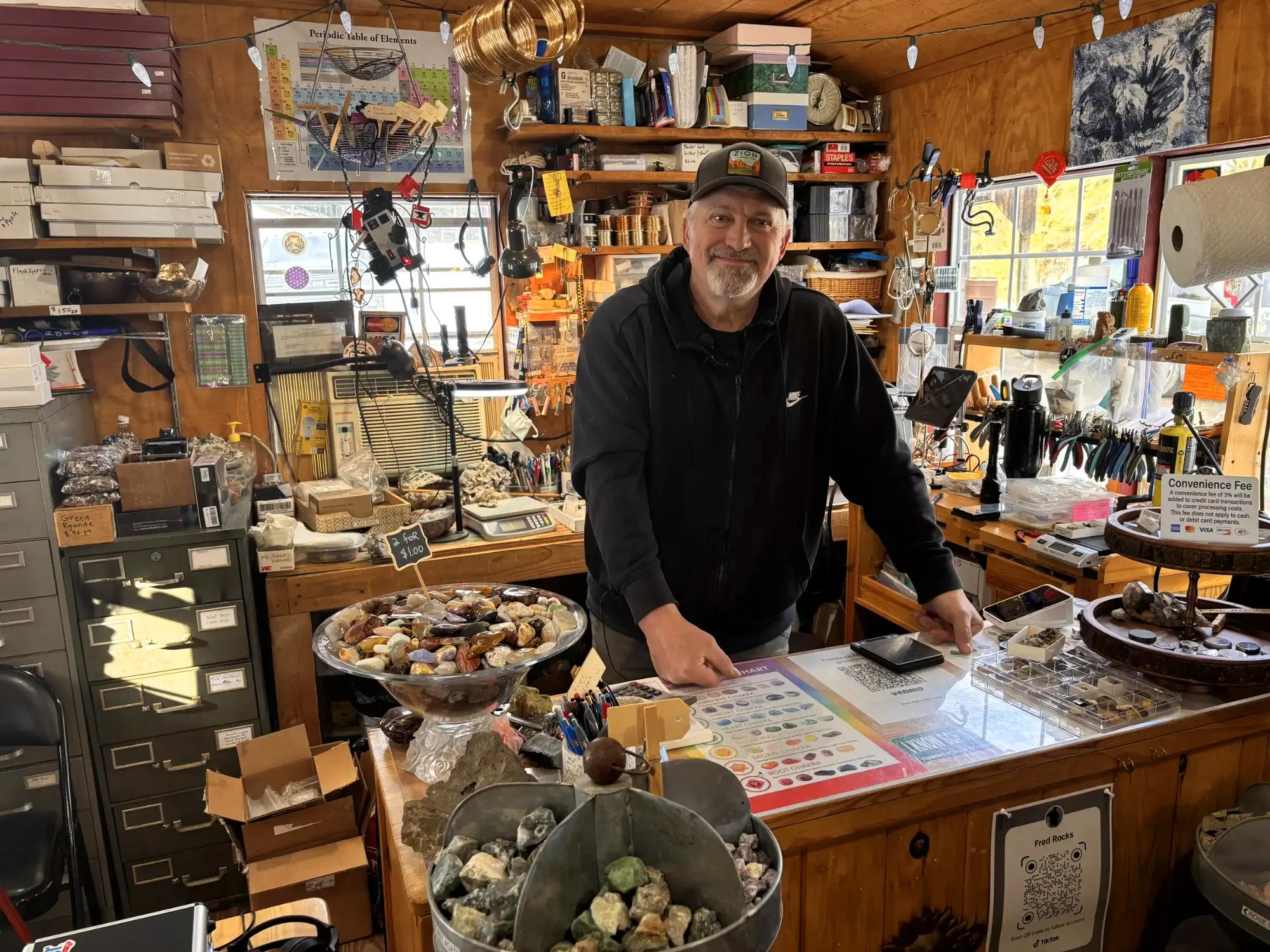 It all started when a friend took him to Rock River in Vermont. The first day there, his pockets were completely full, and his pants were falling down. He kept going back, hauling five-gallon buckets of stones home. The problem was that they looked great wet but dull when dry. That question — how do you make them look good all the time? — led Fred to lapidary work, tumbling, and eventually opening the shop.