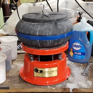 Yes — all tumbling is done right here at the shop in Putney. I started with a 3-pound tumbler and now run a 40-pound tumbler (with multiple sizes in between). The process is similar to sanding wood — going from coarse grit down to a fine polish.